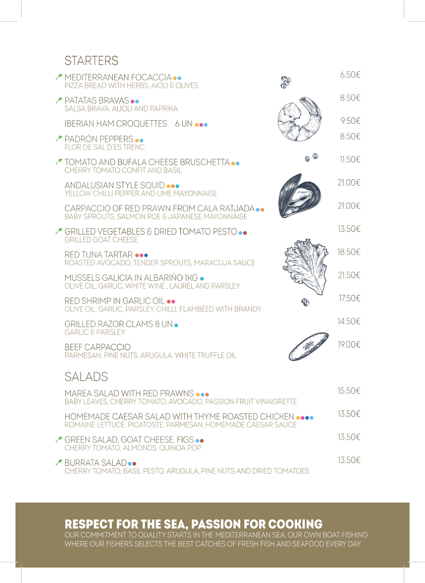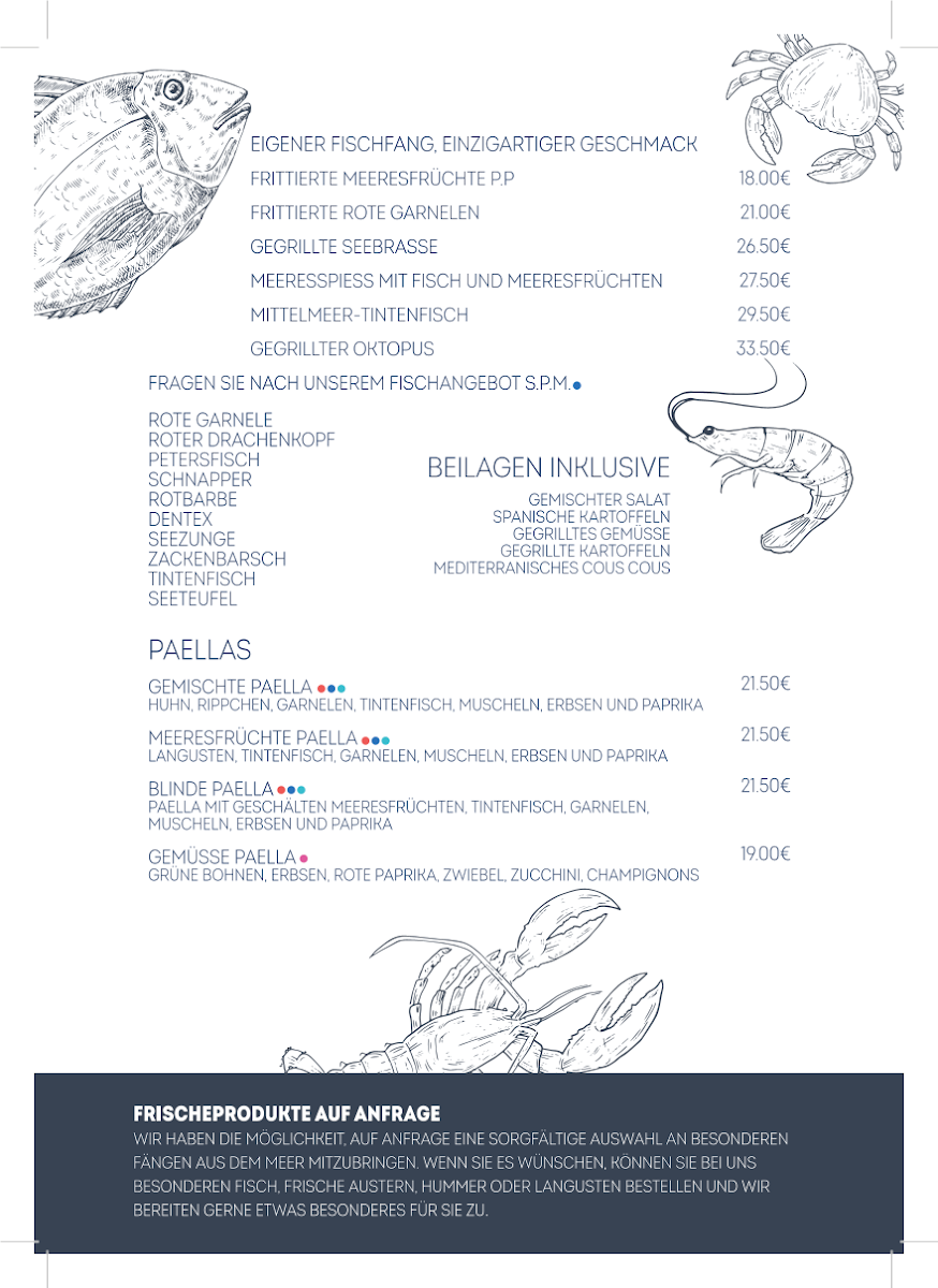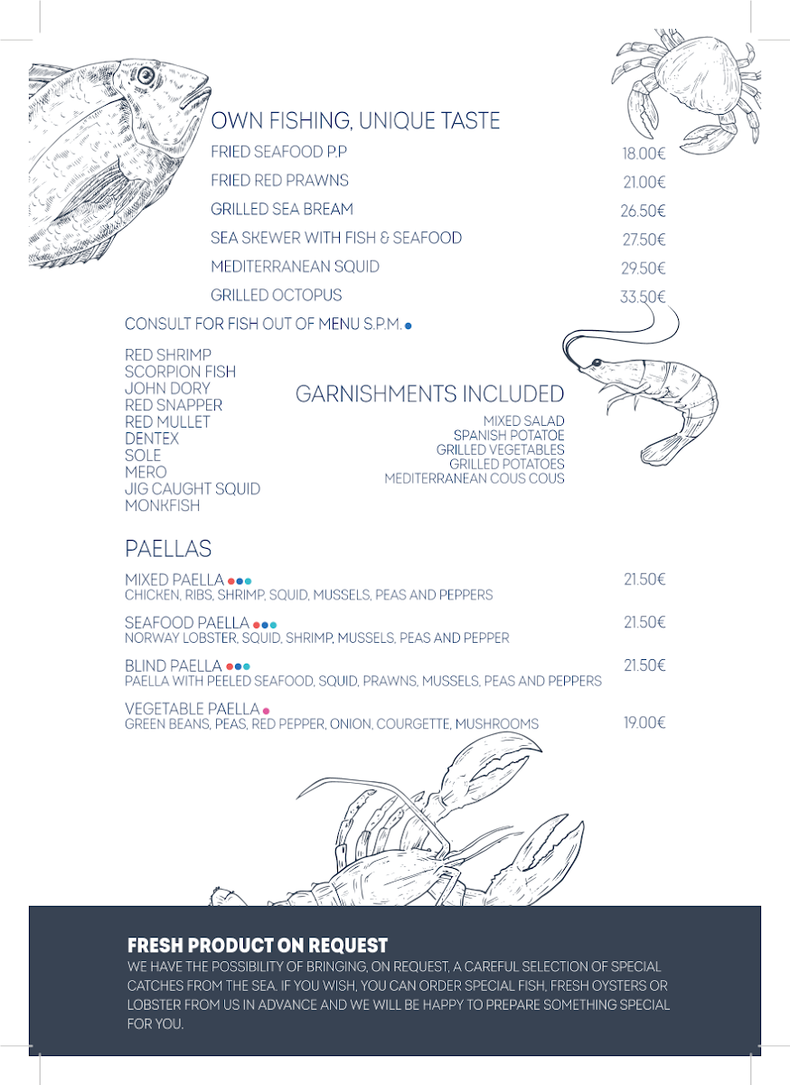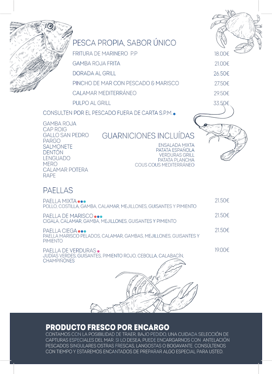 - Carnes: Indulge in the Secreto Ibérico, a tender Iberian pork dish, or savor the Pincho de Ternera con Vegetales, beautifully grilled beef skewers served with mixed salad and alioli.